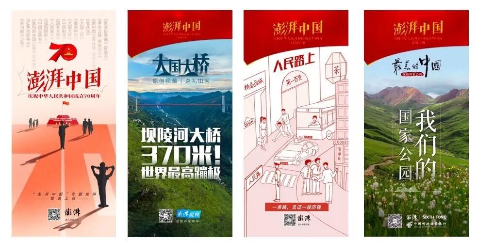澎湃一向重视策划报道,今年,我们策划的一个重点就是新中国成立70周年。澎湃为70周年主题生产了20多个大大小小专题,比如用20多个视频表现9座大桥的《大国大桥》,从策划立项到采访制作发布,历时三周时间,获得了超过1个亿的播放量;而《人民路上》则以12个城市中的12条“人民路”为对象,通过路的变化讲述中国70年间的改变。