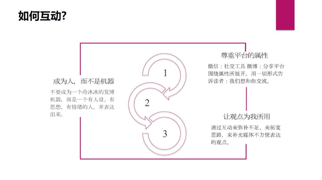 那么如何互动?首先尊重各个平台的属性,大家要研究每个平台的规律。其次,成为人而不是机器,媒体要有点人设,可以偶尔卖萌,跟用户有更个性化的交流;最后,让观点“为我所用”,很多时候观点不能在文章里面表达,评论互动就成了最好的补充。