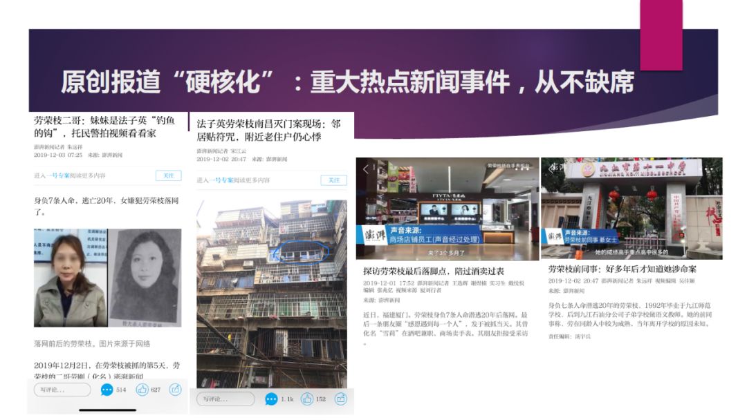 比如针对近期“劳荣枝落网”事件,澎湃新闻同时往福建、江西南昌、九江、安徽等曾经的案发地派出记者,全方位对劳荣枝的家人、被害人的家人进行走访,产出多则优秀报道。
