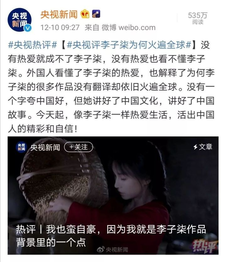 12月5日,公众号“为你写一个故事”发布了一篇题为《李子柒怎么就不是文化输出了?》的文章,很快就达成了“10w+”成就,同时也引发了全网关于李子柒的大讨论。之所以能形成讨论,就意味着观点不一。