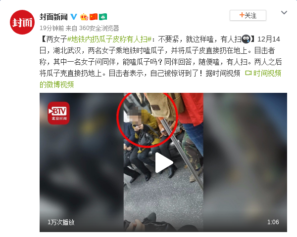 12月14日,湖北武汉,两名女子乘地铁时嗑瓜子,并将瓜子皮直接扔在地上。目击者称,其中一名女子问同伴,能嗑瓜子吗?同伴回答,随便嗑,有人扫。两人之后将瓜子壳直接扔地上。目击者表示,自己被惊讶到了!