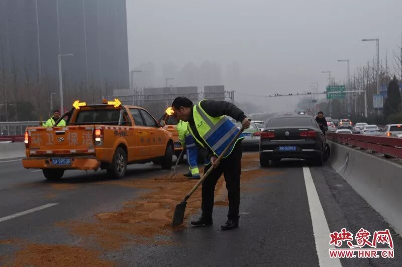 目前,郑州环城快速环卫工人正在清理油污带,郑州交警一大队民警正在处理此事。
