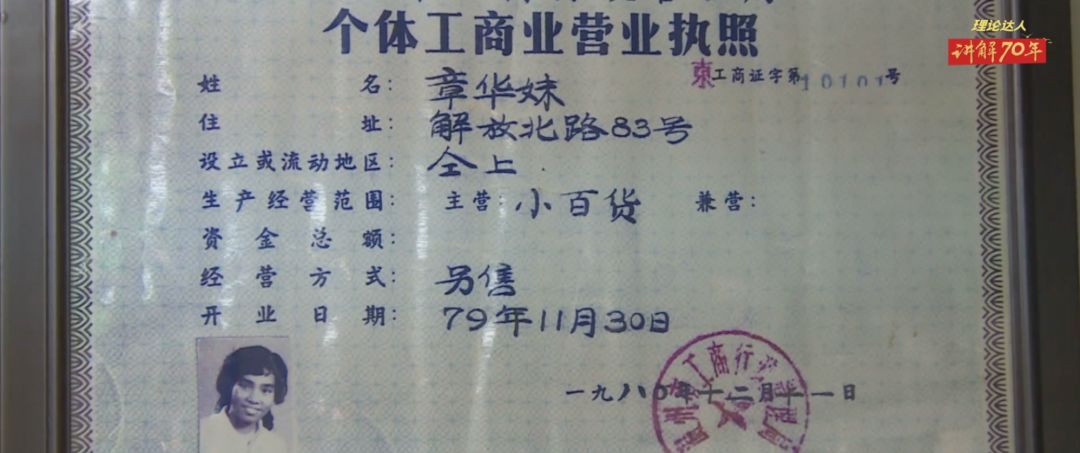 到了1978年,安徽省凤阳县小岗村的村民们把队里的土地分到了户,首创“大包干”联产承包责任制。1979年底,年仅19岁的温州姑娘章华妹将自家临街的窗户打开,办起小百货窗摊。一年后,她成为中国个体工商户领取营业执照的第一人。