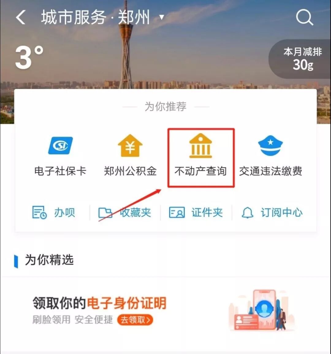 登录支付宝—城市服务,选择“不动产查询”;或者选择办事大厅—更多服务—“不动产查询”。