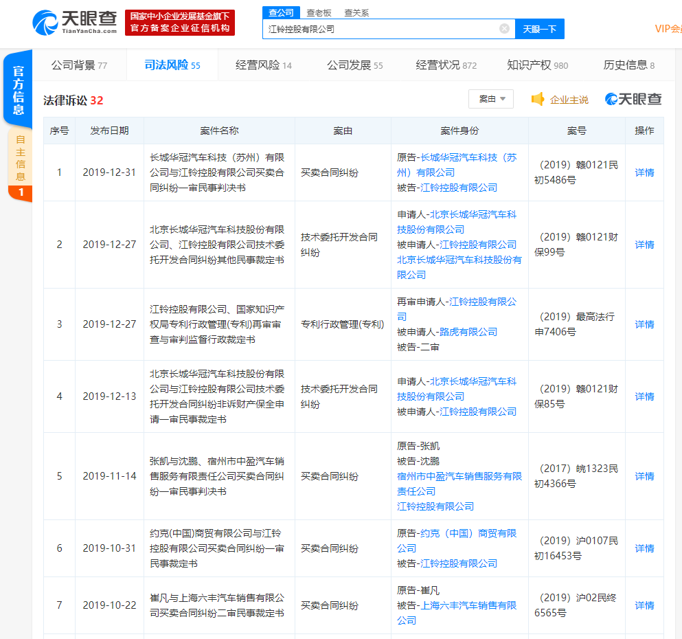 天眼查数据显示,江铃控股有限公司与路虎有限公司涉及商标和专利的判决书有多个,其中最新的一份是2019年12月27日,最高人民法院驳回了江铃控股有限公司的再审申请。