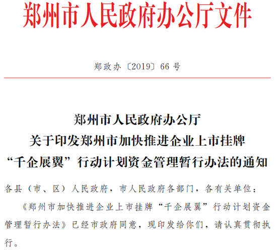 1月10日,郑州市人民政府办公厅印发关于郑州市加快推进企业上市挂牌 “千企展翼” 行动计划资金管理暂行办法的通知,据《通知》,企业在上交所科创板首次公开发行股票,市政府分步骤实施奖励,最高奖1000万元;企业在沪深交易所主板、中小板和创业板上市的,给予总额800万元奖补;对外地上市公司迁址进郑并完成工商登记、纳税登记变更的,市财政给予一次性200万元奖励。