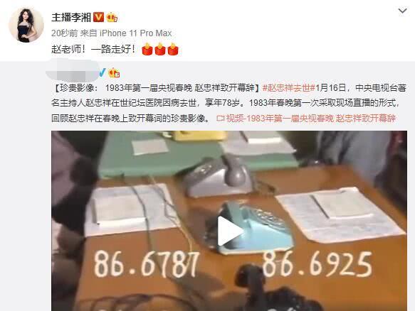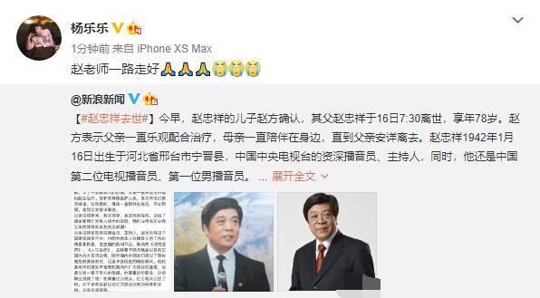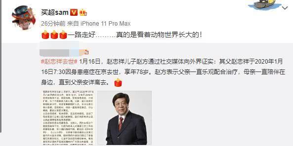 腾讯娱乐讯 1月16日,赵忠祥之子赵方在社交网站证实并宣布,赵忠祥于2020年1月16日7:30分因病在京去世,享年78岁。赵忠祥去世以后刘晓庆、杨乐乐、李湘、张嘉倪老公买超、资深媒体人谢晓都纷纷发文悼念,愿他一路走好。