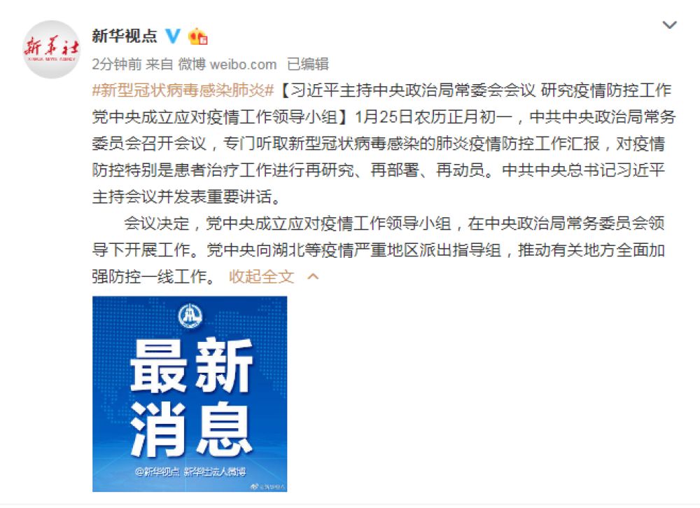 【习近平主持中央政治局常委会会议 研究疫情防控工作 党中央成立应对疫情工作领导小组】1月25日农历正月初一,中共中央政治局常务委员会召开会议,专门听取新型冠状病毒感染的肺炎疫情防控工作汇报,对疫情防控特别是患者治疗工作进行再研究、再部署、再动员。中共中央总书记习近平主持会议并发表重要讲话。