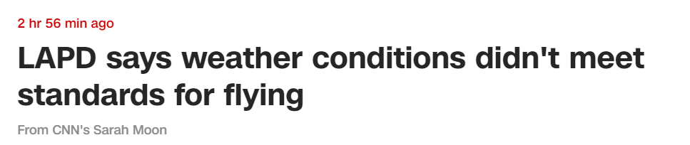 综合美国《洛杉矶时报》及美国有线电视新闻网(CNN)报道称,洛杉矶警察局(LAPD) 发言人乔希·鲁宾斯坦(Josh Rubenstein)表示,26日当天早晨的天气状况并不符合LAPD的最低飞行标准。由于大雾天气,LAPD空中支援部队已于当天早上停飞了他们的直升机。