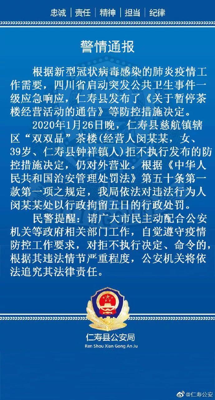 1月27日,四川省眉山市仁寿县公安局发布通报称,根据新型冠状病毒感染的肺炎疫情工作需要,四川省启动突发公共卫生事件一级应急响应,仁寿县发布了《关于暂停茶楼经营活动的通告》等防控措施决定。2020年1月26日晚,仁寿县慈航镇辖区“双双品”茶楼(经营人闵某某,女、39岁、仁寿县钟祥镇人)拒不执行发布的防控措施决定,仍对外营业。根据《中华人民共和国治安管理处罚法》第五十条第一款第一项之规定,仁寿公安依法对违法行为人闵某某处以行政拘留五天的行政处罚。