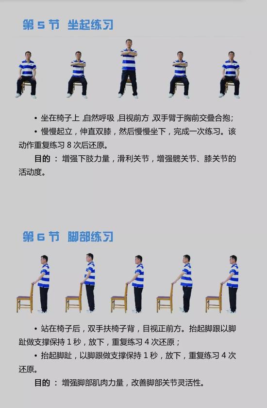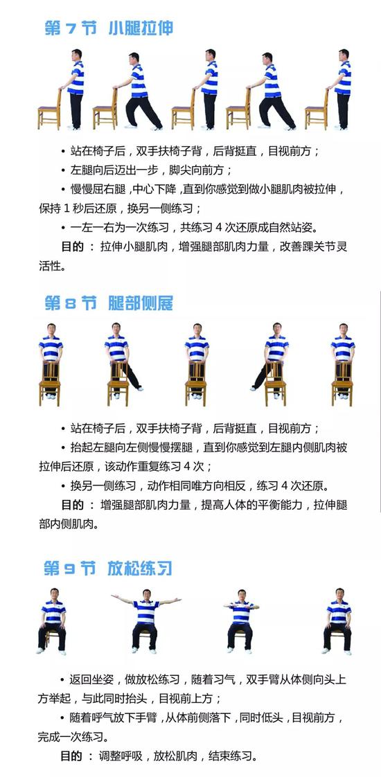 在练习过程中有椅子做支撑,可以减少练习难度,防止运动过程中出现意外。经常练习可以提高肌肉力量,改善机体柔韧性,增强平衡能力,有效预防跌倒。