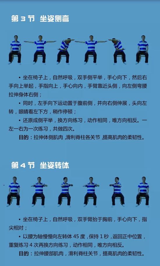 练习时,起始动作要求端正地坐在椅子上,自然呼吸,目视前方,双手臂下垂,双脚平行,脚尖指向正前方,各节动作都以此为开始。