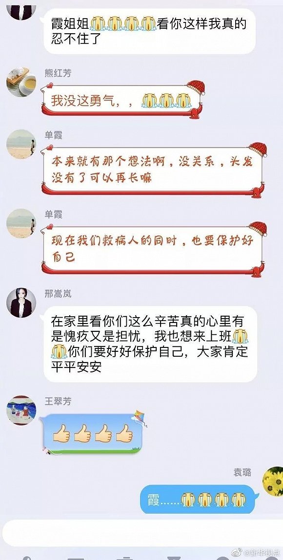 为了避免交叉感染,节约穿脱防护衣帽的时间,两个孩子的母亲、人民医院护士单霞毅然剪掉了自己的长发。“用我及腰长发,换你健康平安”。