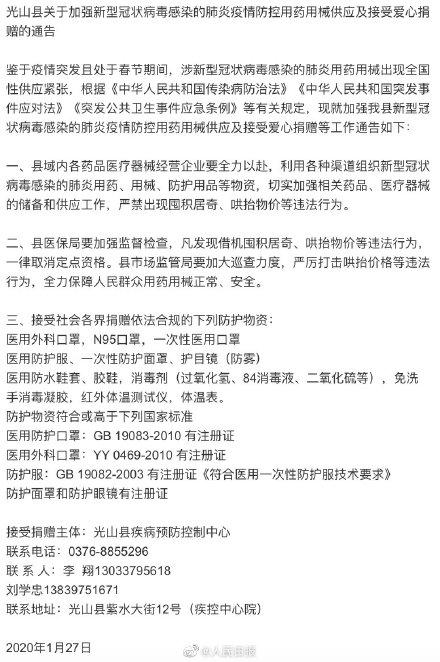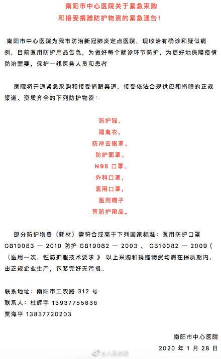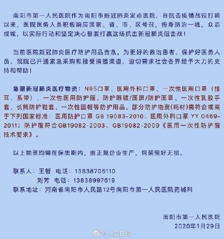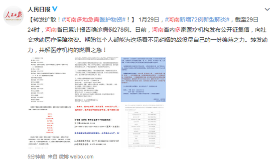 1月29日,河南新增72例新型肺炎,截至29日24时,河南省已累计报告确诊病例278例。日前,河南省内多家医疗机构发布公开征集信,向社会求助医疗保障物资。期盼每个人都能为这场看不见硝烟的战役尽自己的一份绵薄之力。转发助力,共解医疗机构的燃眉之急!