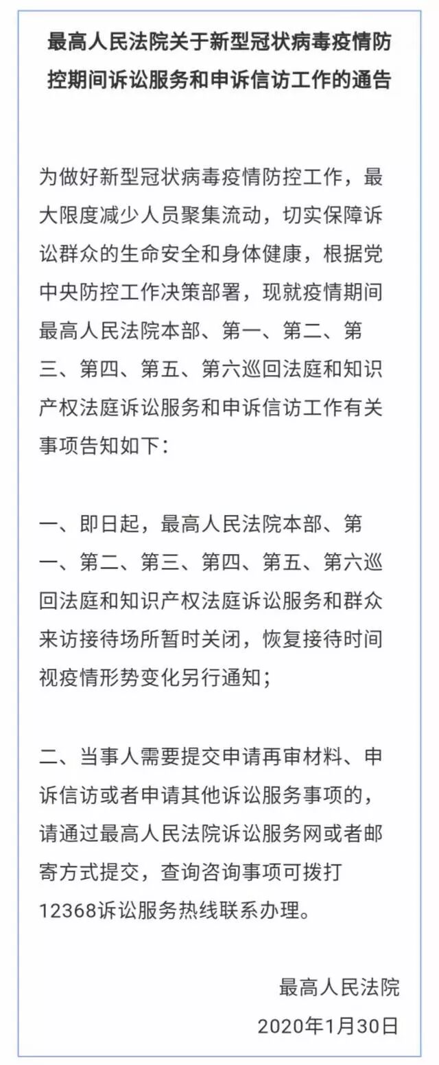 疫情就是命令,防控就是责任。最高人民法院第一时间贯彻落实习近平总书记重要指示精神,成立应对疫情工作领导小组,部署开展相关工作,相继发布了《关于新型冠状病毒疫情防控期间诉讼服务和申诉信访工作的通告》,各地法院也结合实地实情,纷纷下发了紧急通知提出具体要求,公开发布疫情防控期间诉讼提示和公告指南,把群众的生命安全和身体健康放在首位。