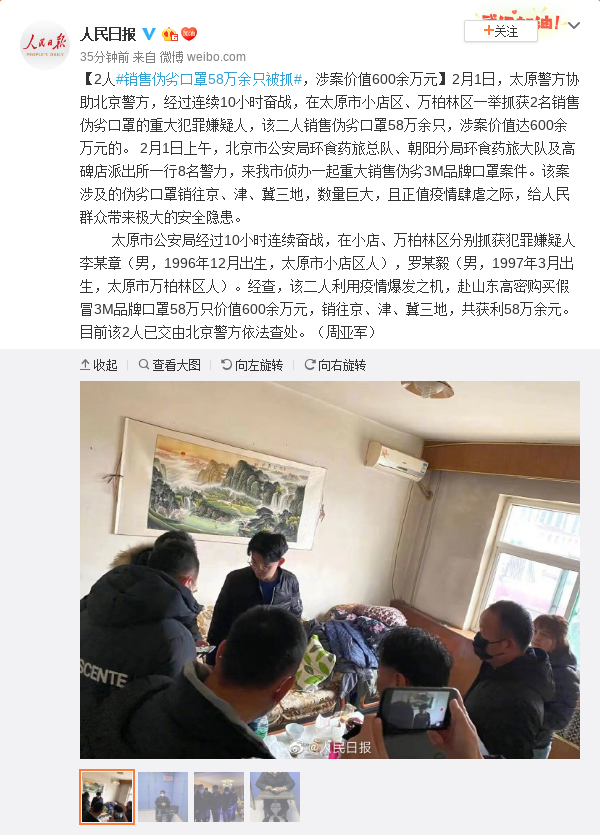 2月1日,太原警方协助北京警方,经过连续10小时奋战,在太原市小店区、万柏林区一举抓获2名销售伪劣口罩的重大犯罪嫌疑人,该二人销售伪劣口罩58万余只,涉案价值达600余万元的。 2月1日上午,北京市公安局环食药旅总队、朝阳分局环食药旅大队及高碑店派出所一行8名警力,来我市侦办一起重大销售伪劣3M品牌口罩案件。该案涉及的伪劣口罩销往京、津、冀三地,数量巨大,且正值疫情肆虐之际,给人民群众带来极大的安全隐患。 太原市公安局经过10小时连续奋战,在小店、万柏林区分别抓获犯罪嫌疑人李某章(男,1996年12月出生,太原市小店区人),罗某毅(男,1997年3月出生,太原市万柏林区人)。经查,该二人利用疫情爆发之机,赴山东高密购买假冒3M品牌口罩58万只价值600余万元,销往京、津、冀三地,共获利58万余元。目前该2人已交由北京警方依法查处。