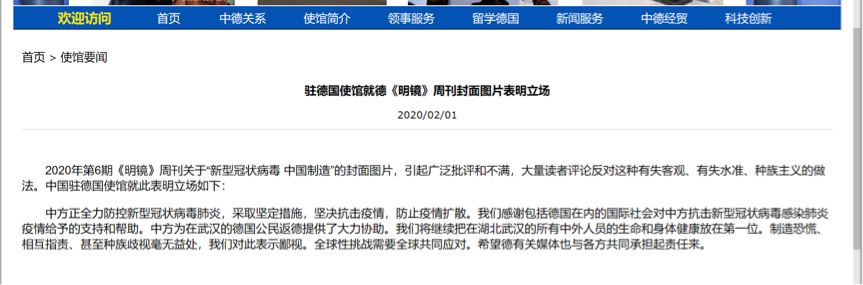 德国媒体自己又怎么看待此事?德国之声中文网在报道中写道:“封面照片发表后,立即招致许多德国民众以及在德国生活华人的强烈抵制。《明镜周刊》周五在其脸书账号下发布了新一期杂志的封面。15个小时后引来320多条评论,大多数评论内容都是持质疑和批评的态度。”2月1日当天,中国驻德国大使馆在其官网和使馆推特发声表明立场。驻德使馆在官网的声明中指出,中方正全力防控新型冠状病毒肺炎,采取坚定措施,坚决抗击疫情,防止疫情扩散。我们感谢包括德国在内的国际社会对中方抗击新型冠状病毒感染肺炎疫情给予的支持和帮助。中方为在武汉的德国公民返德提供了大力协助。