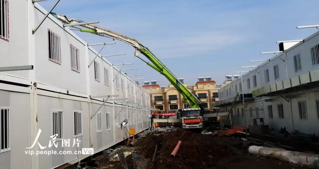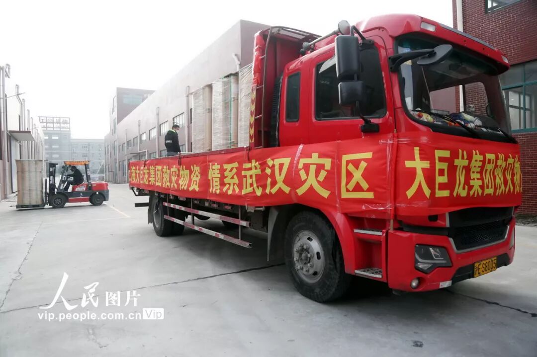 援助火神山和雷神山:2020年1月30日,位于浙江省嘉善县姚庄镇的浙江卡曼橡胶地板有限公司生产基地,两台叉车将第二批捐赠用于武汉火神山和雷神山医院建设的PVC地板装车。胡凌翔/人民图片