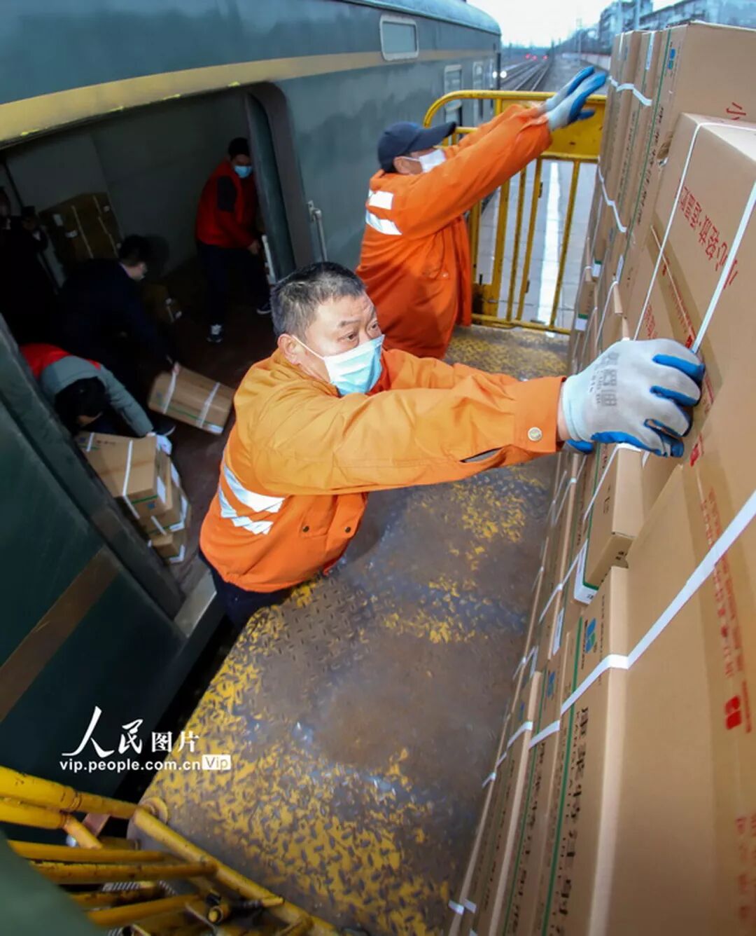 17时39分,K1246次列车停靠鹰潭站,在由鹰潭车站和鹰潭工务机械段18名党、团员组成的物资抢运突击队的协助下,行包装卸人员在8分钟内将500件防疫物资送上行李车,确保了该批防疫物资顺利转运至杭州。张卫东/人民图片