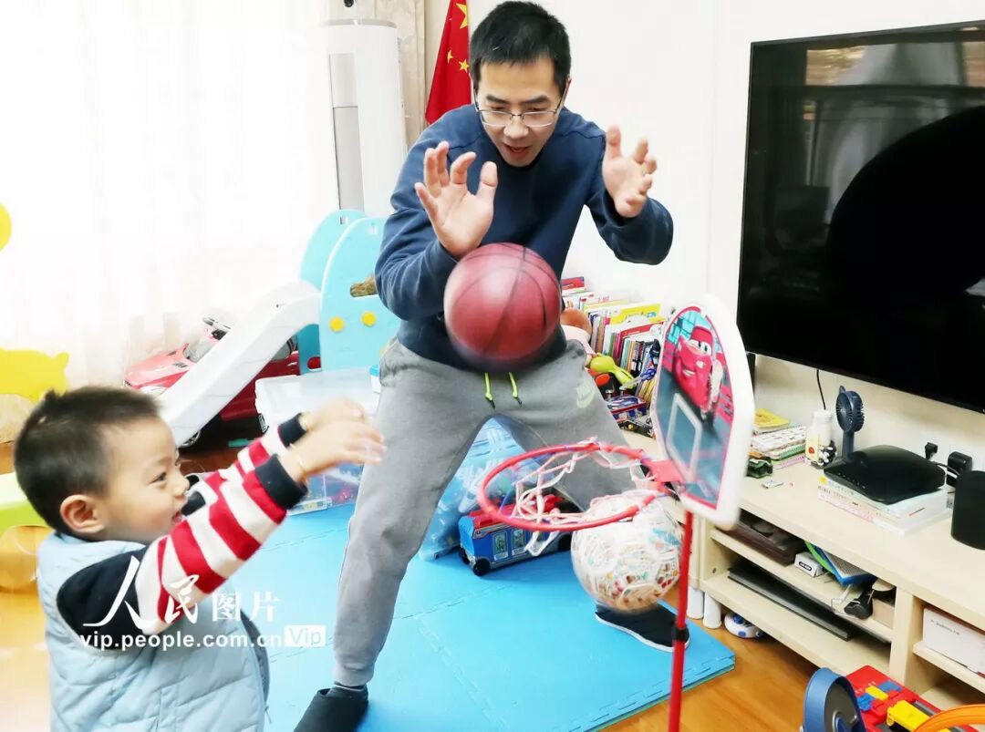 有滋有味的“宅”生活:2020年2月1日,江苏省苏州工业园区新馨花园小区的4岁小朋友华晟桦正在和爸爸在家打篮球。由于新型冠状病毒感染肺炎,这个春节很多家庭不能出去游玩,为防交叉感染,市民们响应政府号召“宅”在家里过春节。华雪根/人民图片