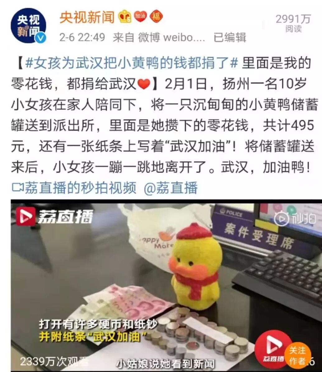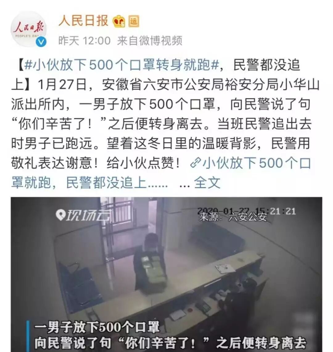 疫情无情 来势汹汹 但人们抗“疫”的努力 却从未停下脚步 温暖的画面 每时每刻都在上演 安徽一小伙 给派出所放下500个口罩 说了句:你们辛苦了 转身就跑 民警都没追上 不要问我是谁 警察叔叔你们辛苦了 我们与你们同在 扬州一个10岁小女孩 将自己攒的495元零花钱 全都捐给武汉 还用纸条写着 “武汉加油!” 这是我的全部积蓄 武汉 加油鸭! 汶川地震后 汶川县100多名伤者 被送到武汉免费救治 “作为汶川人, 最应该感恩!” 这次疫情发生后 四川汶川县三江镇龙竹村村民 主动捐赠 驾车36小时 运送100吨新鲜蔬菜 驰援武汉 6辆卡车上贴着一句话 “汶川感恩你 武汉要雄起” 滴水之恩,涌泉相报 不用说感谢 此刻,我们是一家人 武汉一对90后夫妻 24小时为一线医护人员送餐 老板娘邱贝文和家人 全体出动 驱车20公里 一份盒饭也送 一天跑500公里 两天送了430多份暖心餐 我们不能让冲在最前面的人 连个热饭也吃不上 这是我们这辈子 最值得的一个决定 陆军军医大学医疗队 护士长蒋小娟 因长时间超负荷工作 脸被口罩和护目镜 压得伤痕累累 她却说 贴上“创可贴”再冲锋 我只是千千万万中的一个 别害怕 前方有我们守护 2月2日 武汉火神山医院举行了交付仪式 火神山医院正式交付 人民军队医务工作者 1月23日以来 建筑工人夜以继日加紧施工 10天10夜与时间赛跑 在看不见硝烟的战场上 争分夺秒 只为拯救更多生命 在火神山医院 举行交付仪式的同一天 8架大型军用运输机 依次降落在武汉天河机场 第一时间将军队医务人员 和医疗物资送到最需要的地方 凌晨出动 上午9时30分全部抵达武汉 兵贵神速 千千万万的网民 见证了人民军队的快速反应! 我们不舍昼夜 我们分秒必争 只是想从疫情手里 抢更多的生命