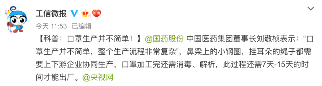 其实,口罩生产并不简单!中国医药集团董事长刘敬桢表示:“整个生产流程非常复杂”,鼻梁上的小钢圈,挂耳朵的绳子都需要上下游企业协同生产,口罩加工完还需消毒、解析,此过程还需7天-15天的时间才能出厂。