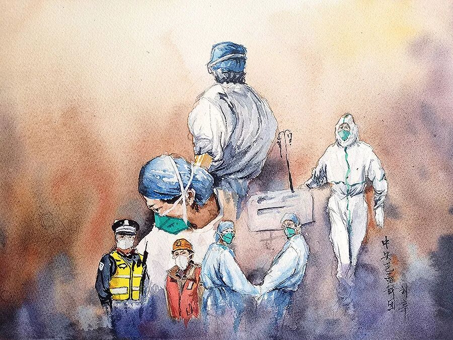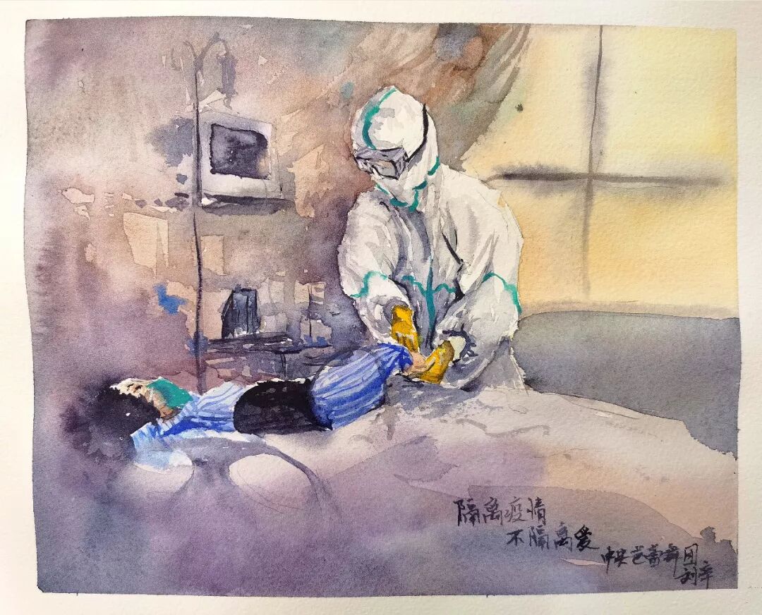水彩画《隔离疫情 不隔离爱》作者:中央芭蕾舞团舞美设计 刘辛