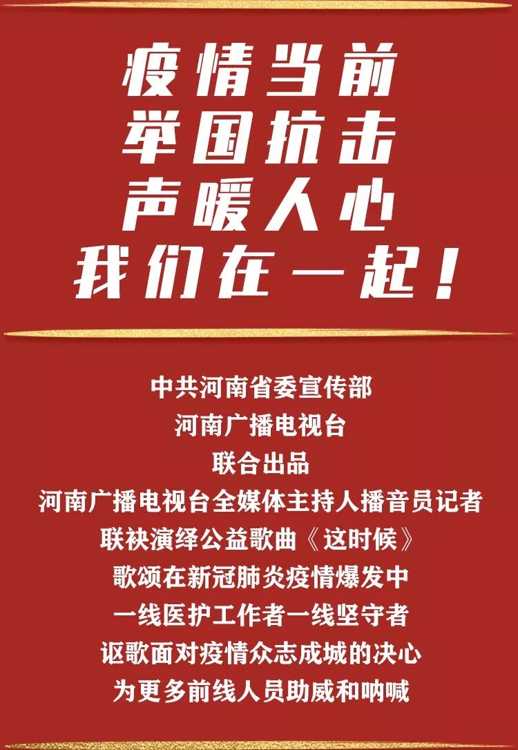 2020年春节注定是一个有着太多感动的春节,感动于那些为抗击疫情而逆行的英雄们的辛苦付出;感动于面对疫情时大家众志成城、共同面对困难的决心和勇气。作为河南广电媒体人的我们用歌声来唱出我们的敬意,为更多前线人员助威和呐喊!
