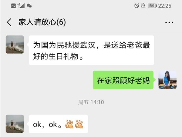 临行前,我给爸爸发了祝他生日快乐的微信。起飞前,收到爸爸的回复:“为国为民驰援武汉,是送给老爸最好的生日礼物。”