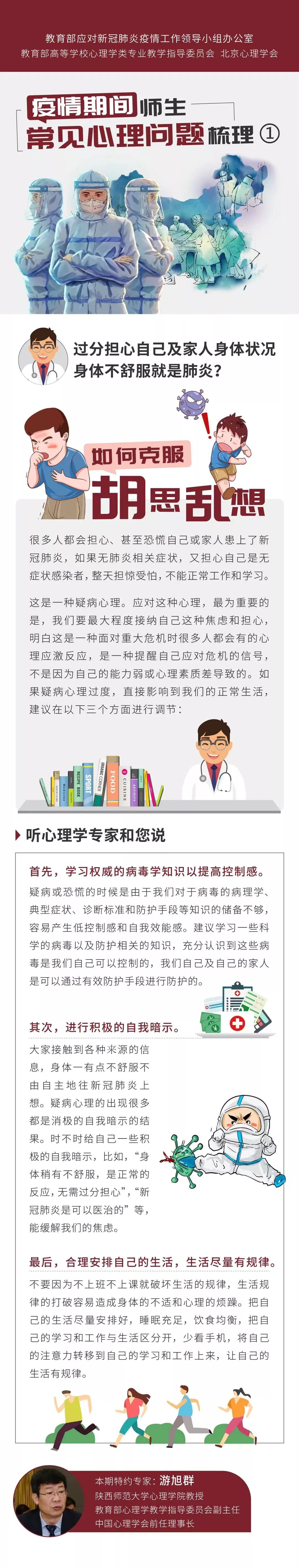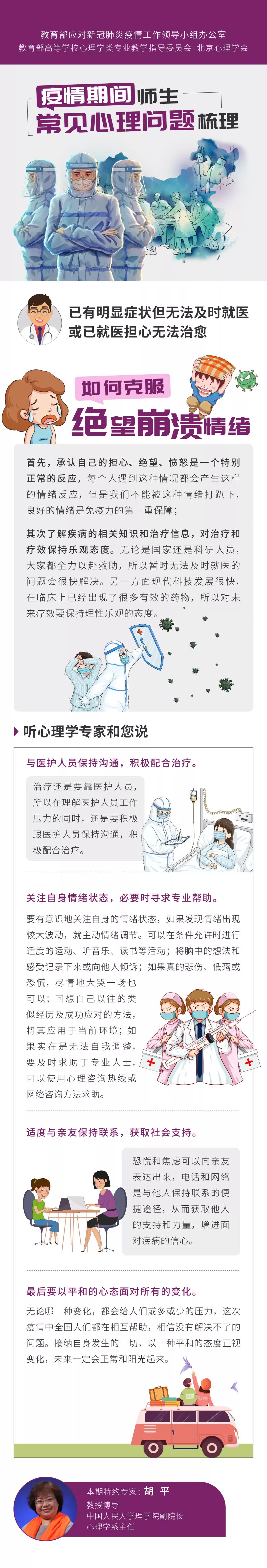 今天,微言教育推出《用“心”战“疫”》第②期,随教育小微一起来听教育部高等学校心理学类专业教学指导委员会特约专家,陕西师范大学游旭群教授、中国人民大学胡平教授、西北师范大学康廷虎教授详解,疫情期间师生常见心理问题如何调整↓↓↓