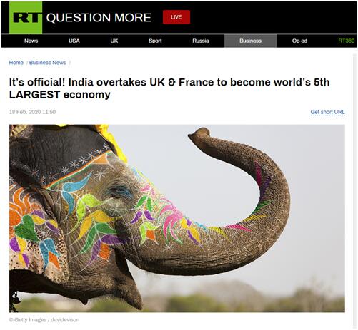 报道称,印度报业托拉斯援引《世界人口审查》的这份报告称,印度2019年国内生产总值(GDP)为2.94万亿美元,超过英国和法国,成为世界第五大经济体。相比之下,英国GDP为2.83万亿美元,法国为2.71万亿美元。