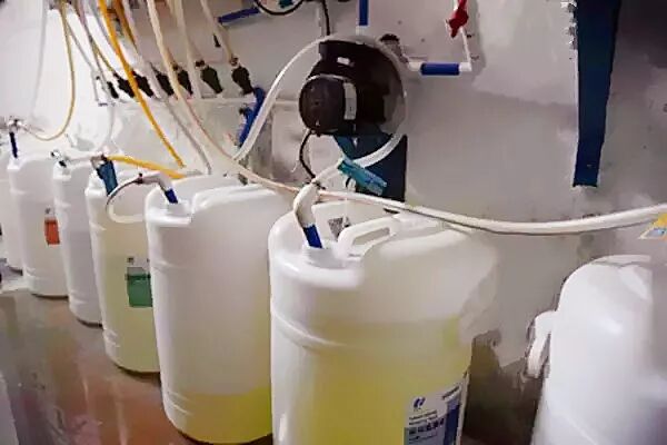 工作人员会根据不同的标准和要求设定好洗涤水温、消毒时间,并投放清洗剂和消毒液。 3 消 毒 一套卧具要经过11道洗涤消毒工序,过程中设备会自动加热,温度逐步加热至80摄氏度,在这样的恒定高温下要足足转洗约50分钟。 专用桶中的消毒液 会根据设定自动加入