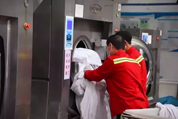 洗涤后的卧具会被放入烘干机内烘干,然后工作人员将卧具用高温熨烫机进行最后的处理:一方面熨烫卧具至平整,另一方面可以进一步高温消毒。
