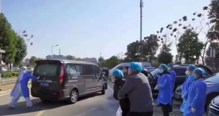 2月18日下午,在同济医院中法院区外,运送刘智明遗体的车辆缓缓驶离,妻子蔡利萍追着殡仪车失声痛哭。几名身穿蓝色防护服的医护人员在车旁难掩悲痛。