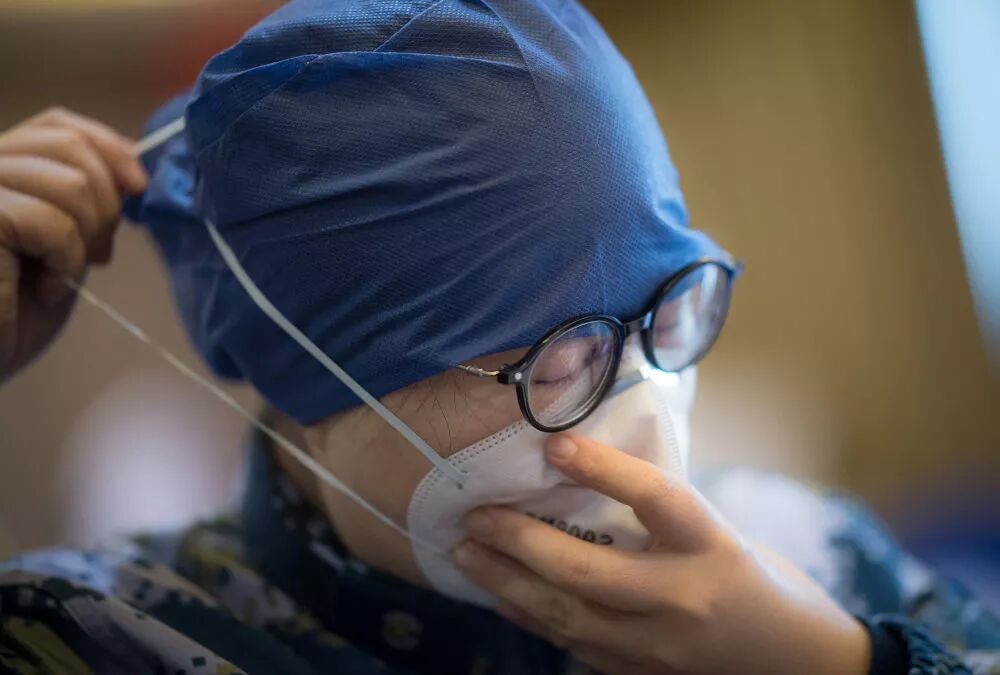 1月27日,海军军医大学医疗队员在穿戴口罩。