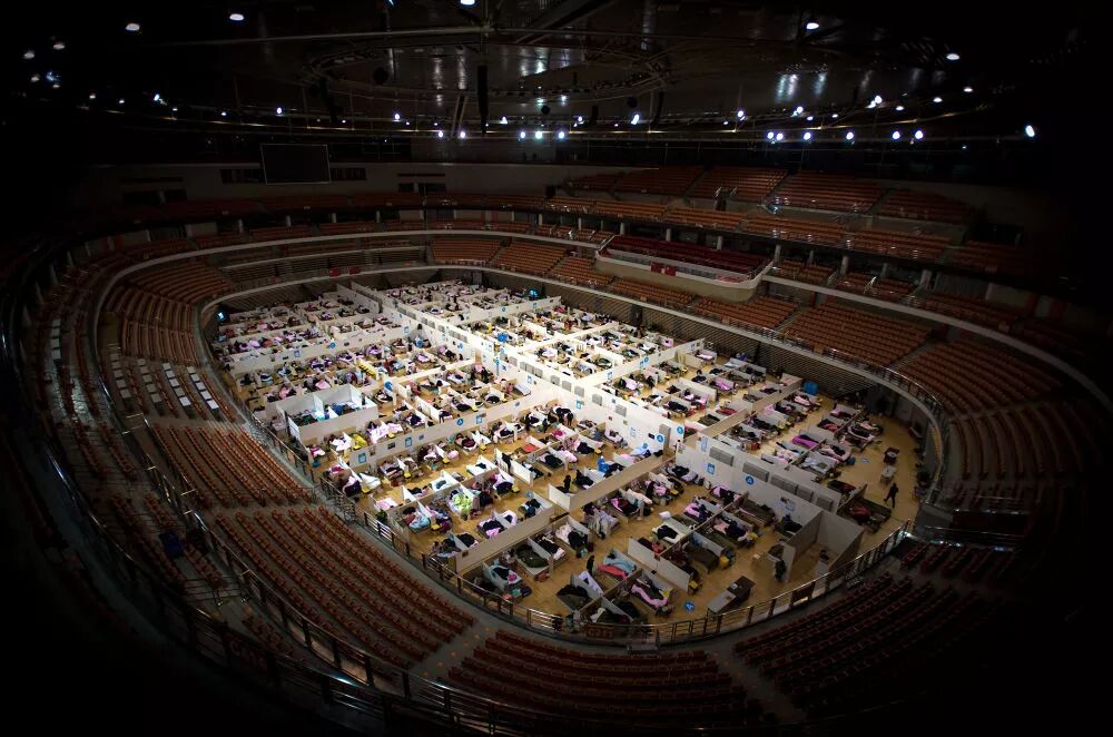 到达四楼看台的那一刻,我被眼前的景象瞬间震撼了:整个体育中心宛若一艘诺亚方舟!一格格、一间间,井然有序:患者在里面休息治疗,医务人员不断地穿梭忙碌其间,宁静而繁忙。