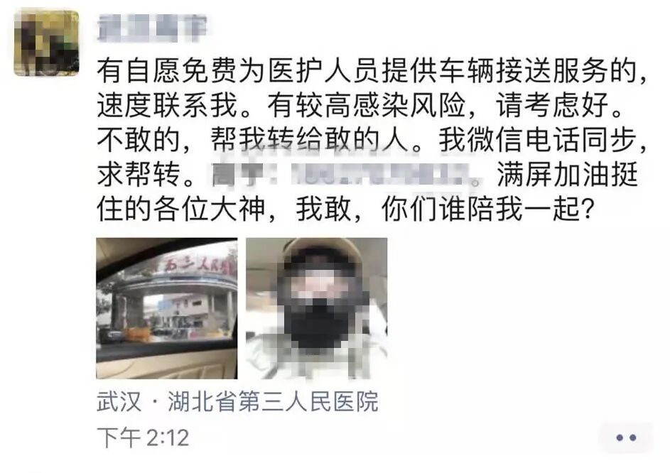 1月23日,武汉关闭离汉通道后,在家待命的艾旭突然看到朋友圈里一则消息:“有自愿免费为医护人员提供车辆接送服务的速联系我,有较高感染风险,请慎重考虑。”