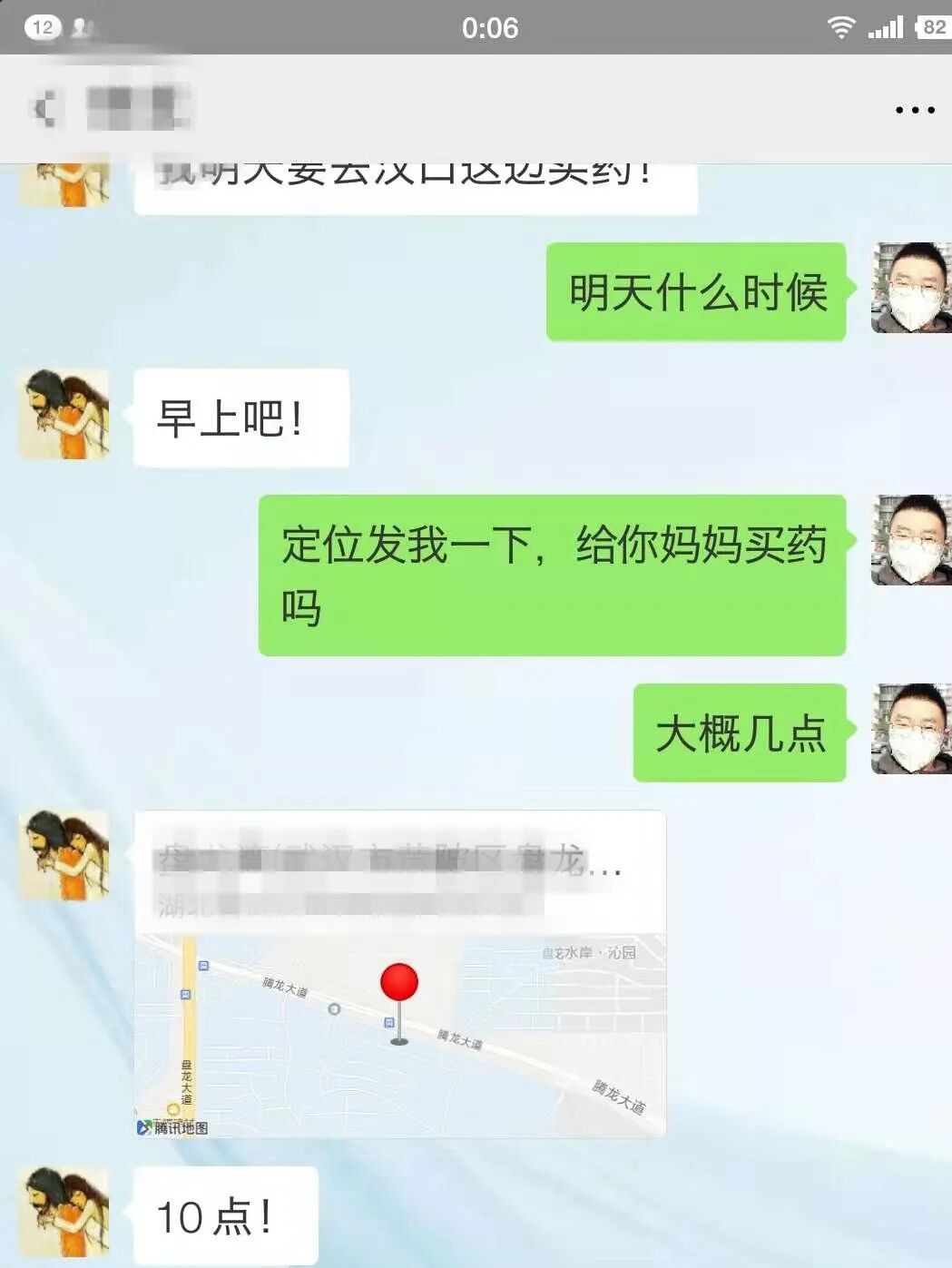 1月30日,艾旭刚完成一趟医护人员接送任务,微信群内的一则求助信息映入眼帘,由于公共交通停摆,一名女孩曾用数小时步行往返盘龙城与硚口区航空路新特药大药房之间,为身患乳腺癌的母亲买药,药物快用完又急需用药。艾旭赶紧联系这个女孩:“请问是宗艾吗?定位发我一下,给你妈妈买药。”