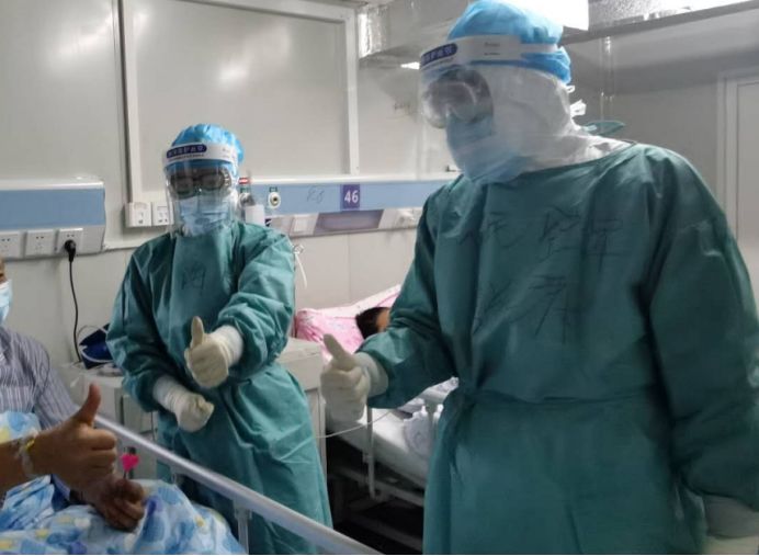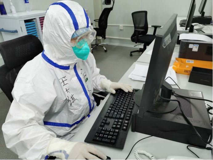 工作中的王士祺。 进入火神山医院的每一天都像在打仗,压力不仅来自患者复杂的病情,还来自和患者的沟通安抚上。医护人员戴着三层帽子,严重影响听力,两层口罩也影响发音,必须凑得很近才听得到说得清。有时患者很紧张不能准确描述病情,有些当地的患者只会说方言也听不懂医嘱。王士祺一面安慰他们减轻压力,一面问清病情进展,制定个体化治疗方案。每天晚上下班后还要查资料,不断修正治疗方案。 生日当天,他穿着厚厚的防护服巡视了60名患者,不知不觉已经工作近8小时了。夜色渐浓,医院外由于刚刚下过雨,能见度越来越低,病房里却闷热潮湿,耳边传来鼓风机巨大的轰鸣,让王士祺有些喘不过来气。突然,他听闻一名老先生也是今天生日,心想:这真是缘分,一个人在这里治疗,肯定比我更需要生日的祝福。赶忙走到老人的病区,留下了和80岁患者共过生日的珍贵合影。 2月6日是唐梅28岁的生日,也是她所在的护理组为进驻火神山医院作准备的一天。