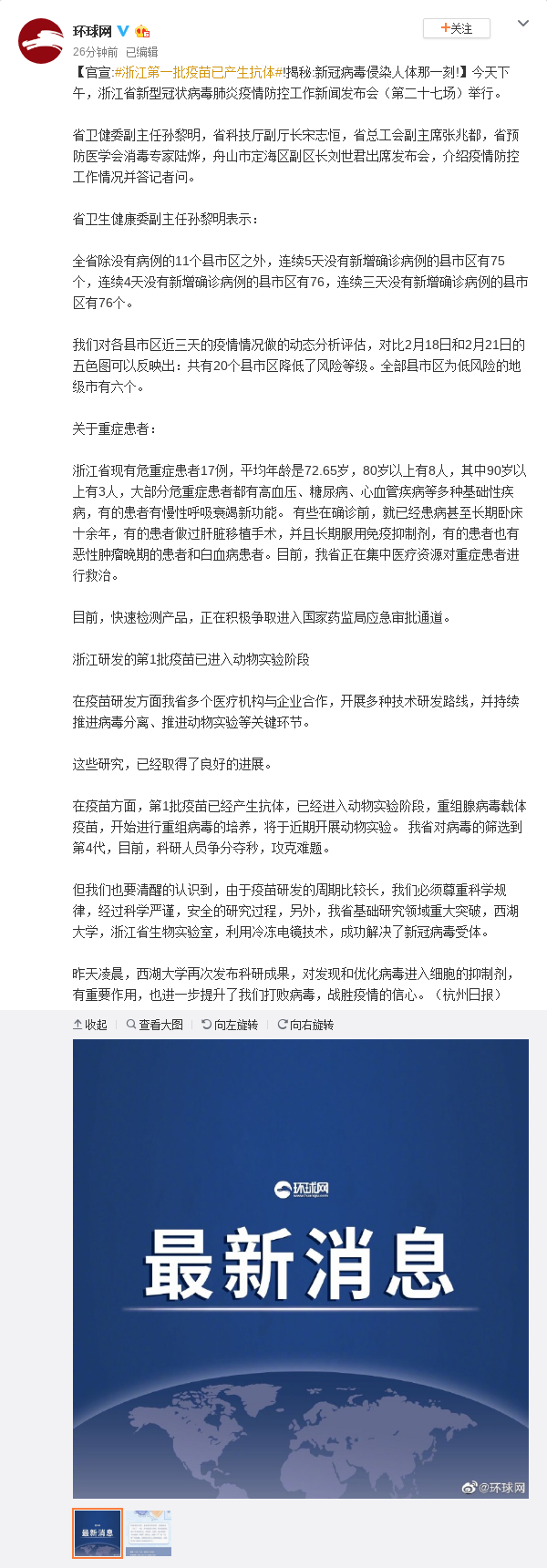 22日下午,在浙江省新型冠状病毒肺炎疫情防控工作新闻发布会(第二十七场)上,浙江省科技厅副厅长宋志恒表示,第1批疫苗已经产生抗体,已经进入动物实验阶段,重组腺病毒载体疫苗,开始进行重组病毒的培养,将于近期开展动物实验。