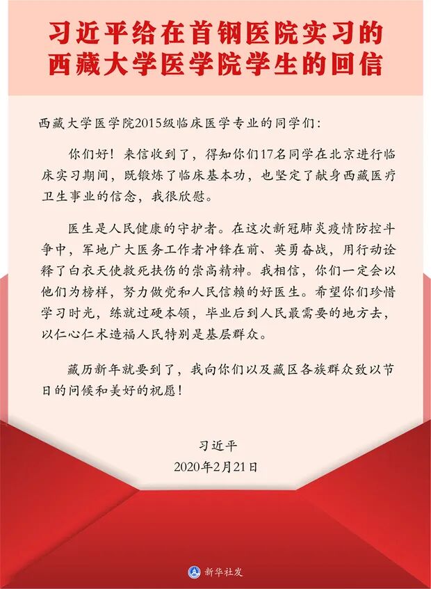 2020年初,在北京大学首钢医院实习的西藏大学医学院的同学们集体给习近平总书记写信,汇报了他们在北京的学习和生活情况,对新中国成立70年来取得巨大发展成就感到欢欣鼓舞,表达了他们对国家关心西藏人民生活、关心西藏医学生的培养、支持西藏医疗事业的感激之情。