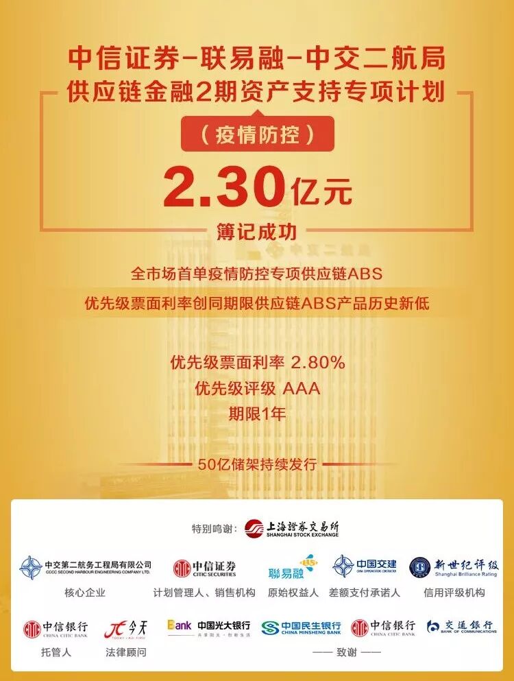 中交集团所属二航局在上交所簿记发行了全市场首单疫情防控资产支持证券(ABS),发行规模2.3亿元,募集资金主要用于给予供应链上游中小型企业资金支持,帮扶恢复生产,进一步支持疫区一线抗疫企业、相关疫区医院及科研实验室的建设以及相关疫情防控项目的建设投入。