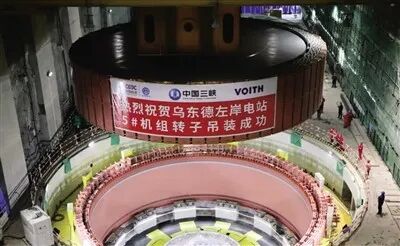 ▲近日,由中国能建葛洲坝集团承担安装施工任务的乌东德水电站左岸地下电站5号机组转子成功吊装。