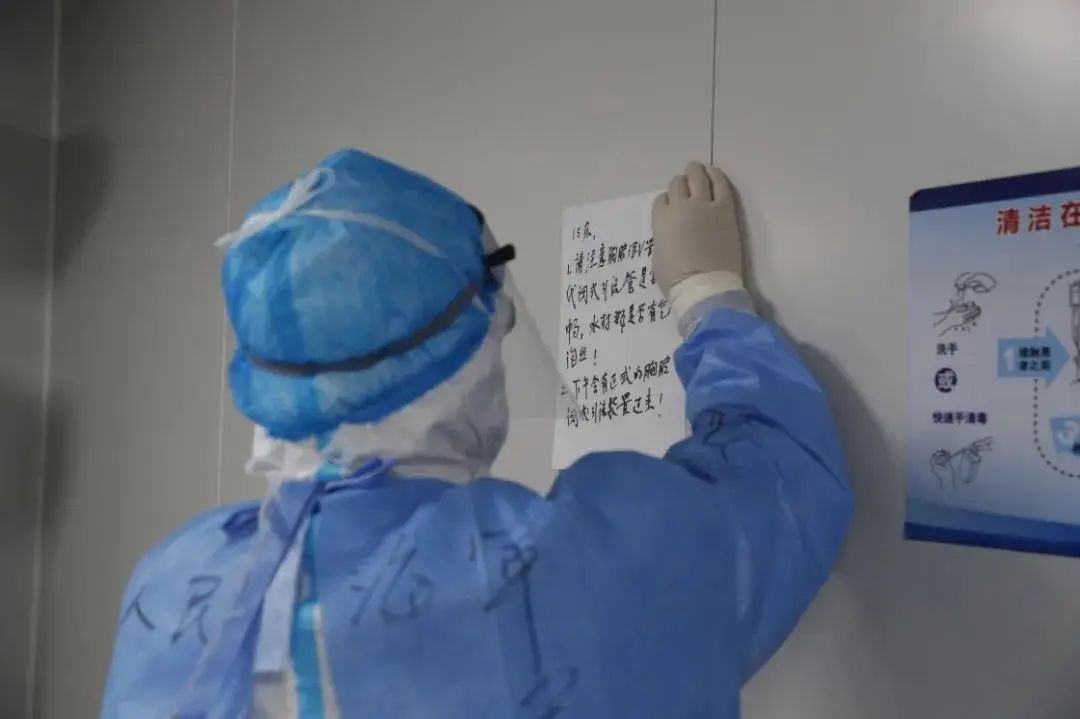 2月24日,在武汉火神山医院重症监护室内,李文放把写有注意事项的A4纸贴在患者床头。新华社发(吴浩宇 摄)