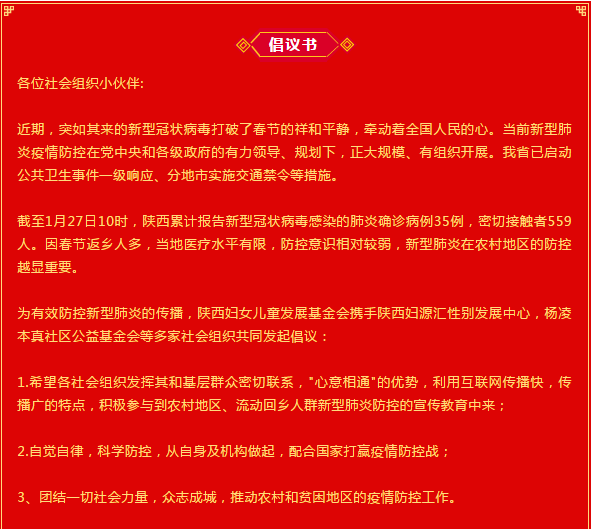 陕西妇女儿童发展基金会携手陕西妇源汇性别发展中心、杨凌本真社区公益基金会等多家社会组织共同发起倡议,各社会组织积极参与针对农村地区和流动回乡人群的防疫宣传工作。