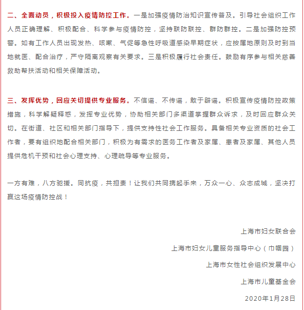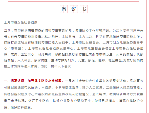 上海市妇联、上海市妇女儿童服务指导中心(巾帼园)、上海市女性社会组织发展中心和上海市儿童基金会联合发布了《致全市女性社会组织倡议书》,号召全市女性社会组织要提高认识,加强落实防控决策部署;全面动员,积极投入疫情防控工作;发挥优势,回应社会关切,提供专业服务。