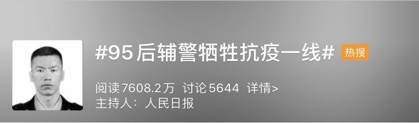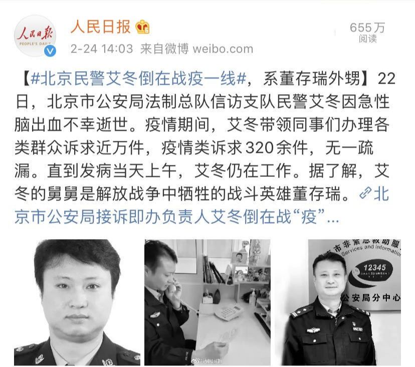 同样是在22日,噩耗再次传来。据@中国警察网 ,北京市公安局法制总队信访支队民警艾冬,因急性脑出血不幸牺牲在抗击新冠肺炎疫情防控的第一线,年仅45岁。