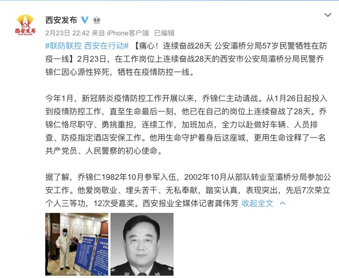 让人痛惜的事情再度发生。2月23日,据@西安发布 ,陕西西安市公安局灞桥分局民警乔锦仁因心源性猝死,牺牲在疫情防控一线。