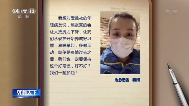 我想对爱熬夜的年轻病友说,熬夜真的会让人抵抗力下降,让我们从现在开始养成好习惯,早睡早起,多做运动,即使是疫情过去之后,我们也一定要保持这个好习惯,好不好?我们一起加油! ——治愈患者黎婧