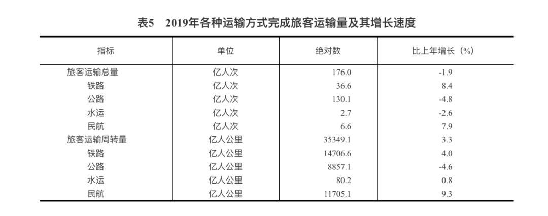 [39]旅客运输总量包括铁路、公路、水运、民航营业性旅客运输量,其中公路旅客运输量占70%以上。近年来,随着人们出行方式的变化,居民自驾出行、网络约车及拼车人数增长较快,分流了公路客运量,导致旅客运输总量下降。